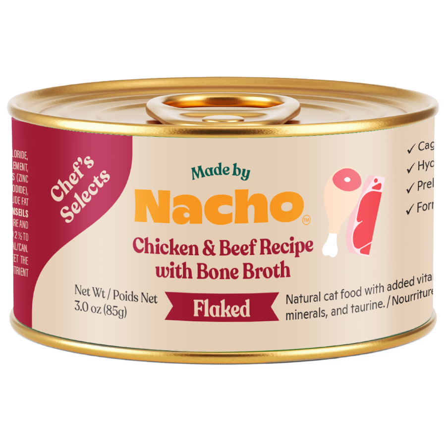 Made by Nacho Chef’s Selects Flaked Chicken & Beef Recipe is a landlubber’s feast your cat can’t resist. Flaked cage-free chicken and premium beef deliver high-quality protein to support strong, healthy muscles. The light, flaky texture makes every bite irresistible. Pumpkin-infused bone broth adds hydration and rich, slow-simmered taste. Prebiotics support digestion, while spinach and cranberries provide fiber and antioxidants. No grains, no fillers—just premium wet food every cat deserves.