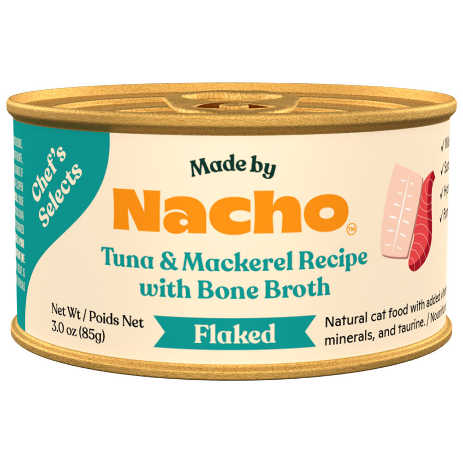 Our Chef’s Selects Flaked Tuna & Mackerel Recipe is like treating your cat to a five-star seafood feast. Premium, wild-caught, dolphin-safe tuna pairs perfectly with mackerel for pure ocean flavor—and loads of healthy Omega Fatty Acids—in every bite. Pumpkin-infused bone broth adds hydration and a slow-simmered taste. Prebiotics provide digestive support, and spinach and kale add fiber and antioxidants. No grains, no-nonsense, just the delectable wet cat food every cat deserves.