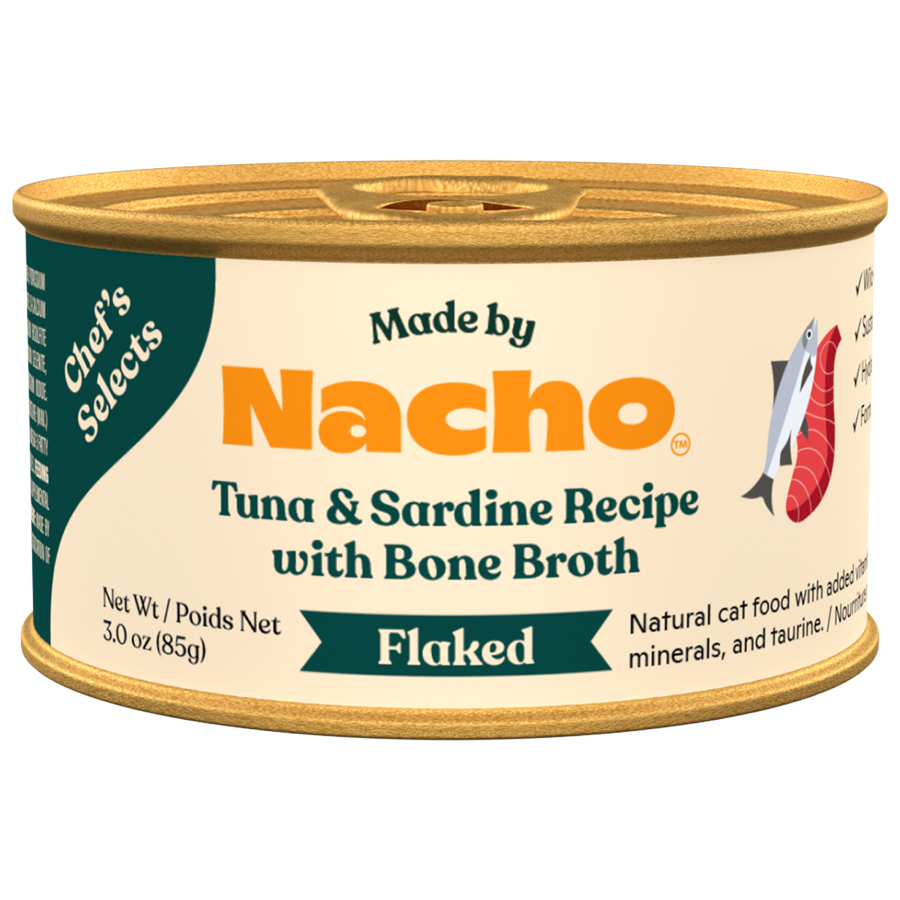 Our Chef’s Selects Flaked Tuna & Sardine Recipe is like treating your cat to a five-star seafood feast. Premium, wild-caught, dolphin-safe tuna pairs perfectly with sardine for pure ocean flavor—and loads of healthy Omega Fatty Acids—in every bite. Pumpkin-infused bone broth adds hydration and a slow-simmered taste. Prebiotics provide digestive support, and spinach and kale add fiber and antioxidants. No grains, no-nonsense, just the delectable wet cat food every cat deserves.